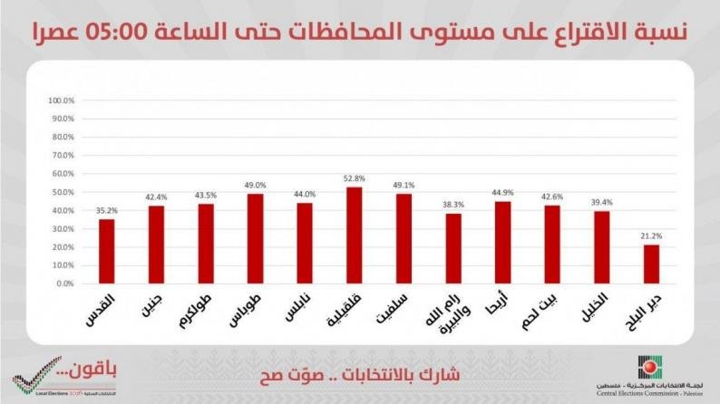 وأضافت أن نسبة الاقتراع في دير البلح بقطاع غزة بلغت 21.2% حتى التوقيت ذاته.