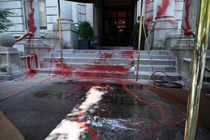 المسار الإخباري : نشطاء يسكبون طلاءً أحمر ويخطّون شعار "جو خان يكذب،…