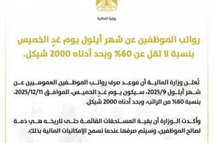 المالية تعلن صرف رواتب الموظفين غدًا الخميس بنسبة 60% وبحد أدنى 2000 شيكل